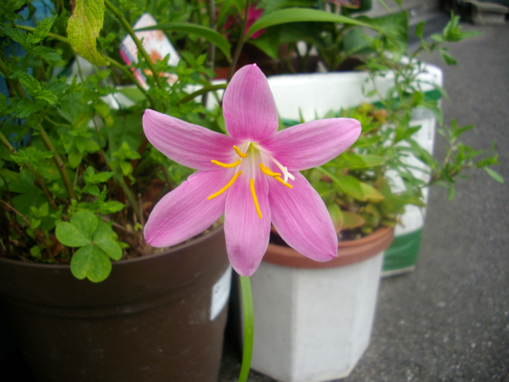 かわいい植木鉢がいたるところに。夏水仙かな。